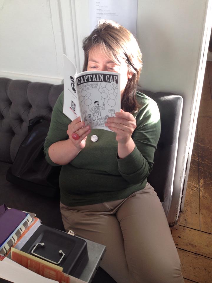Poet Edith Doove reading a rare edition of Allais’s Captain Cap at Plymouth Arts Centre (UK).