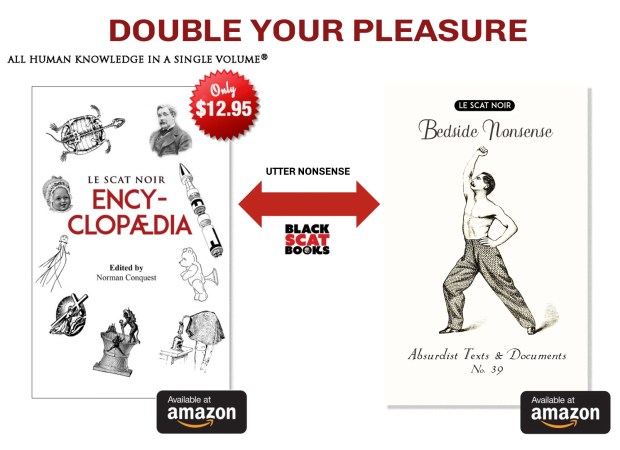 GOT NONSENSE? June 12, 2020 Yes we do. Le Scat Noir Encyclopaedia Le Scat Noir Bedside Nonsense Tough choice. Simple solution: buy both. Share this: Share on X (Opens in new window) X Share on Facebook (Opens in new window) Facebook Email a link to a friend (Opens in new window) Email Share on Pinterest (Opens in new window) Pinterest More Share on LinkedIn (Opens in new window) LinkedIn Like Loading... Related