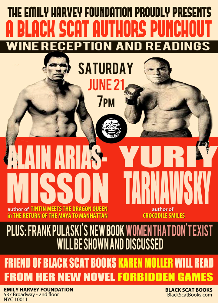 Last Saturday’s BLACK SCAT AUTHORS PUNCHOUT at the Emily Harvey Foundation in NYC was packed. The bloodthirsty crowd was eager to see a K.O. but had to settle for wine. Nothing beats a night of fiction and fisticuffs and these “Lit Bull” contenders were all victorious—Alain Arias-Misson, Yuriy Tarnawsky, Karen Moller, and (in absentia) Frank Pulaski.