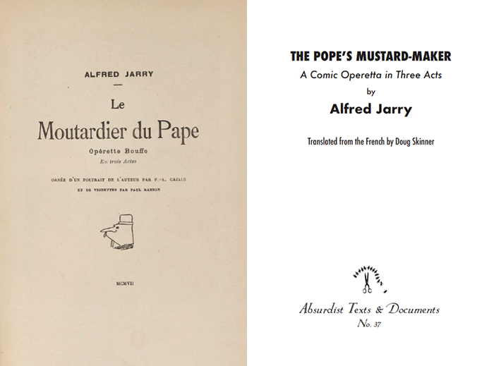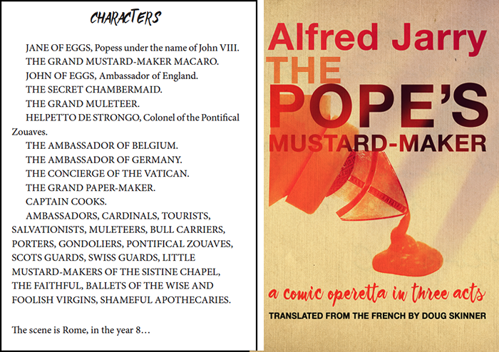The Pope’s Mustard-Maker (Le Moutardier du pape) was the last work that Alfred Jarry finished, a few months before his death in 1907. It is a bawdy three-act farce loosely based on the medieval legend of Pope Joan, with a huge cast and lively songs bubbling with rhymes and wordplay.