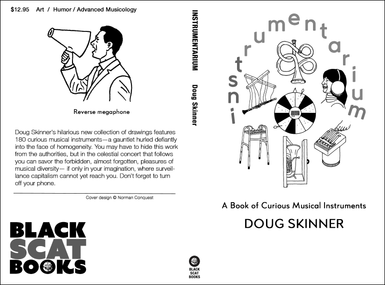 Doug Skinner‘s delightfully absurd musical instruments appeared each month in the pages of our journal, Le Scat Noir. The artist has now rounded up all these drawings (along with previously unpublished specimens) for his new collection Instrumentarium: A Book of Curious Musical Instruments. Even if you’re tone deaf, this book will have you humming along, snapping your fingers, tapping your feet and laughing out loud.