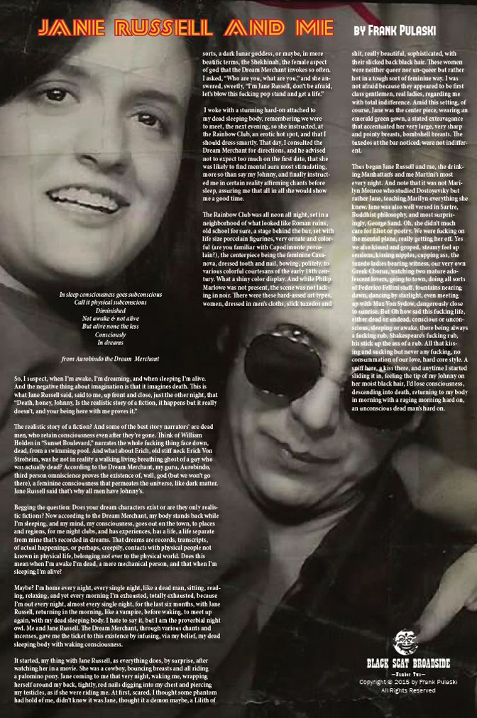 We’re pleased to announce the release of the second in our series of Black Scat Broadsides. JANE RUSSELL AND ME by Frank Pulaski, an erotic surrealist memoir.