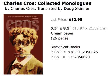 This edition collects all 22 of Cros’s monologues—masterfully translated & introduced by Doug Skinner—and includes performance notes by Coquelin, plus two biographical essays by his friend and colleague Alphonse Allais.